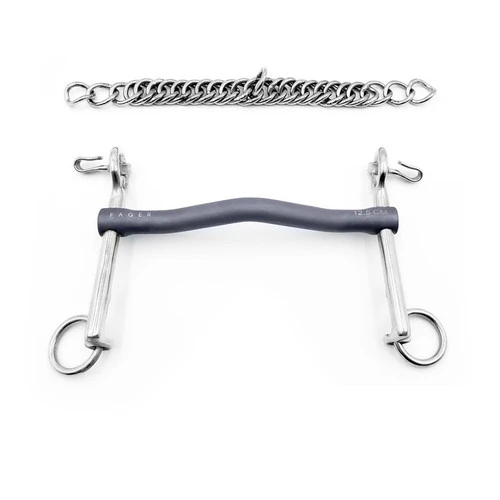 The Fager Elisabeth Titanium Weymouth has a low port that is bent forward, not up toward the palate. The tongue has freedom to move and the horse can swallow easily. It also allows more space for the bradoon. The forward bent port reduces pressure on the bars and decreases the chance of friction. The Elisabeth mouthpiece places most pressure on the tongue, while the chain will add chin and poll pressure. The Elisabeth Weymouth has an Anoblast titanium mouthpiece that is exceptionally durable, strong, free of metal taste, and hypoallergenic. The unique Anoblast process gives the bit its distinctive matte silver color. The Fager Elisabeth Titanium Weymouth is eligible for . Click now for details!