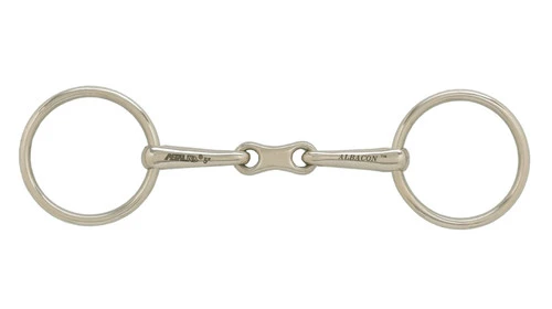 Albacon loose ring bradoon with french link mouth. 13mm mouth, 55mm rings. Made of high-copper form of German Silver to stimulate salivation and prevent dry mouth, with the same appearance as German Silver. Sizes: 5.25, 5.5, 5.75, 6.