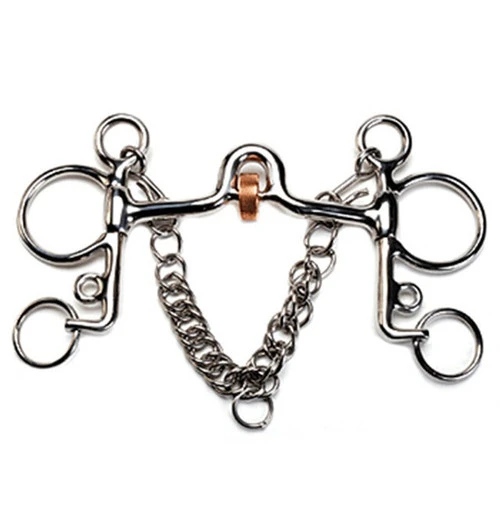 Carefully crafted of Stainless Steel, the Roller Mouth Pelham Bit features a ported copper roller mouth and 6″ cheeks. High corrective port adds to palate pressure while roller helps a busy-mouthed horse and encourages salivation. One size fits most horses. Long shank polo and English pelham comes in size 5 mouth.