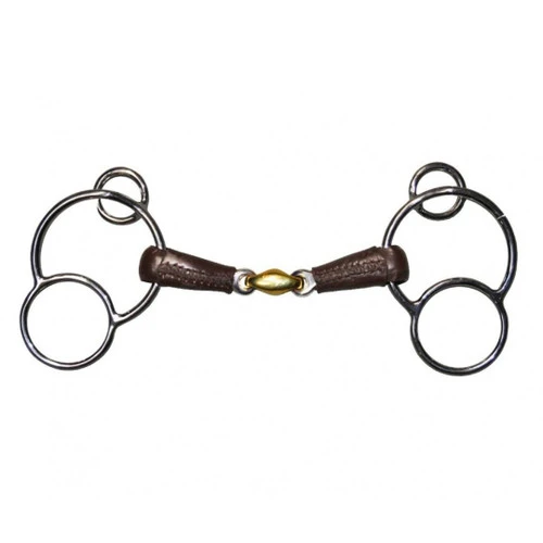 Jump’in Leather Wrap Lozenge 3-Ring Bit has a unique configuration with a leather covered double jointed mouthpiece and gag effect. The stainless steel mouth is securely wrapped in soft leather to soften contact and encourage bit acceptance. The French mouth lozenge in the center is German Silver, an alloy that also enhances salivation.