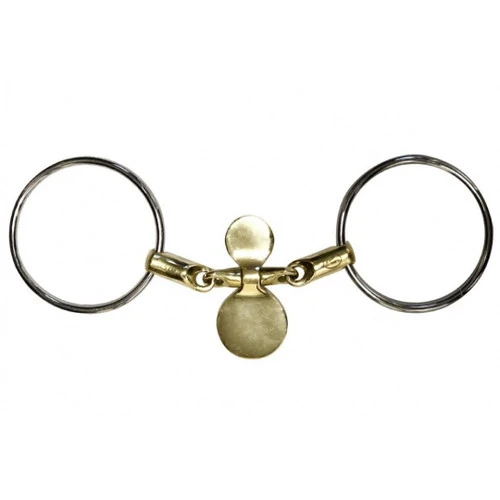 Jump’in Tongue Bit Loose Ring features a pivoting double disk that lies flat on the tongue to prevent the tongue from going over the bit. If your horse constantly tries to evade contact and put his tongue over the bit, this tongue spoon style can help correct the problem.