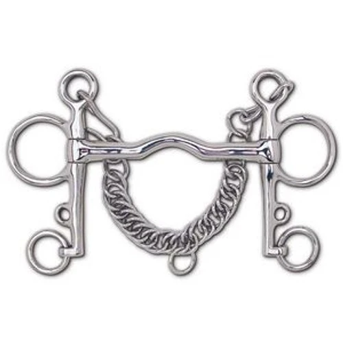 Stainless Steel Low Port/Half Moon Pelham bit with 5.25″ cheek. It features a low ported mullen mouth in Size: 5