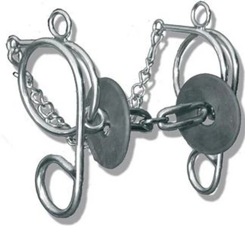Mikmar Watson Swoop Bit is a very useful elevator/gag style bit for the light-handed rider with a horse who occasionally needs a stronger signal. The unique Swoop Bit designed for Mikmar by Richard Watson allows the rider to be soft and quiet then employ gradually more pressure as needed. The cheek pieces have a large right with a bar attached to a small ring. When the reins are engaged, the bit activates in a slow swooping motion as it moves up higher in the horse’s mouth. The mouthpiece offers the mild contact and function of a snaffle while the cheeks and curb chain deliver the leverage effect of an elevator or gag bit. The curb chain should fit loosely so it only comes into play when more leverage is needed.