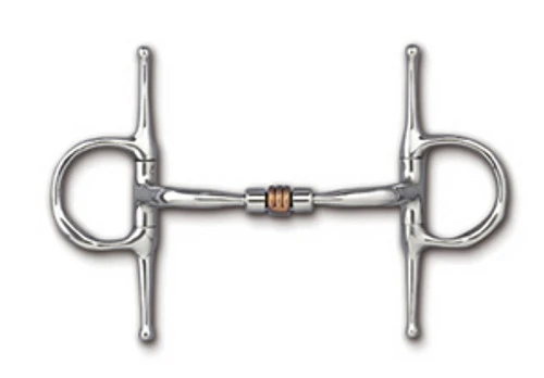 Myler Full Cheek with Hooks Copper Roller Comfort Snaffle – MB 03. Myler Stainless Steel 6″ Full Cheek with Hooks with Stainless Steel Comfort Snaffle Copper Roller (MB 03) Copper Inlay Mouth. LEVEL 1. The creators of Myler Bits, Ron, Dale and Bob Myler, offer a philosophy behind each of their bits: the bit is a communication tool between the horse and rider, and in order to effectively communicate with the horse, the rider needs a bit which allows the horse to be relaxed. Keeping this in mind, the Myler Bitting System is based on the concept of tongue relief. The most common traditional bit, the jointed mouthpiece, applies constant pressure by collapsing on the tongue and inhibiting the horse’s ability to swallow. If the horse can’t swallow, he can’t move forward relaxed. The unique designs of Myler Bits offer varying degrees of tongue relief for the horse depending on his level of training and his disposition. Size 5.