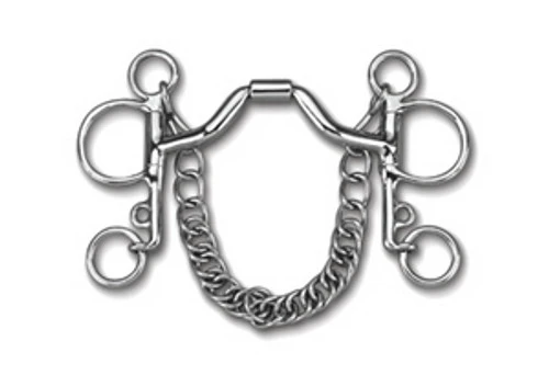 Myler Pelham Ported Barrel Bit has a Myler MB 33 mouth. Myler stainless steel 4.5″ Pelham has a stainless steel Ported Barrel (MB 33) Copper Inlay Mouth. This is a Myler LEVEL 3 English bit. The higher wide port offers more tongue relief to the horse than Level 1 or Level 2 Myler bits. It is the mildest Myler mouthpiece with the most tongue room. It does not rotate onto the tongue and applies little to no tongue pressure. It works primarily off the bars, lips, chin, and poll.The 1 1/2″ port is not high enough to apply significant palate pressure. Available in sizes: 5, 5.5.