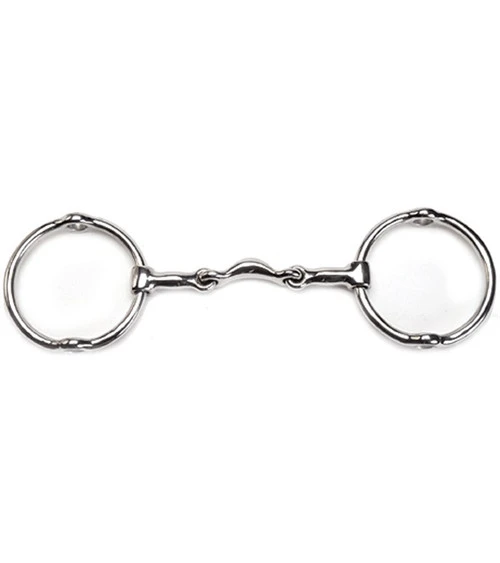 Made of stainless steel with a double jointed mouthpiece, the Quarter Moon English Gag Bit features three inch sliding cheek rings and a quarter moon lozenge. Available in size 5 that fits most horses. The loose rings have openings for leather or rope gag cheeks. Can also be used without gag cheeks as a loose ring bit for schooling.
