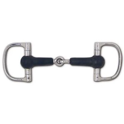 A basic bit found in most tack rooms, this Rubber Mouth Snaffle Dee has three inch dee rings and comes in sizes 4.75, 5, and 5.5 inches to fit almost any horse. The rubber coating of this English bit softens the bit and gives your horse something to chew on for better bit acceptance. Please inspect your bit carefully prior to each use to check for damage to the rubber that can occur over time.