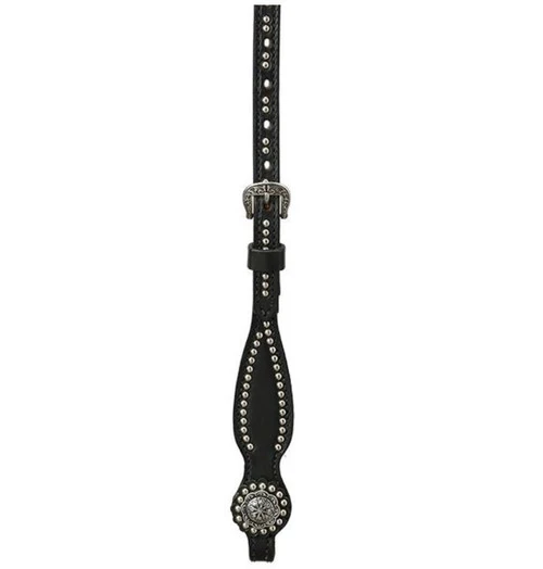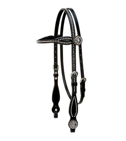 Stunning Black Browband Headstall with silver spots at Marystack.com! Back in Black Browband Headstall by Weaver is the new look in horse headstalls. Made with premium black English leather bridle leather this black headstall is accented with floral conchos and nickel plated brass spots. Leather measures 5/8″. Brow band tapers from wide to just 1/2″ across the front which gives a sleek, refined look to your horse! Cheeks have tear drop shape. Handsome Back in Black Headstall from Weaver will look great on just about any horse!