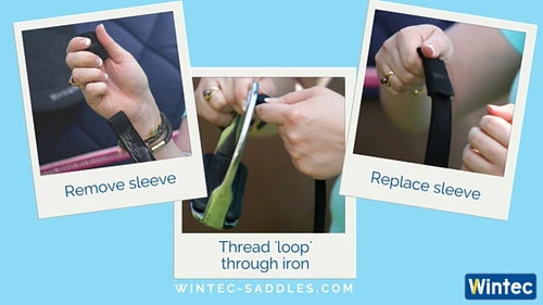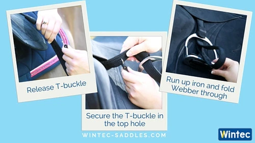 The revolutionary design of Wintec Webbers means there is only a single length of strap and no buckles to create a bulge under your saddle and against your leg. This allows a close contact feel with your horse. Refer to the step by step photos for attaching and using your Wintec Webbers.
